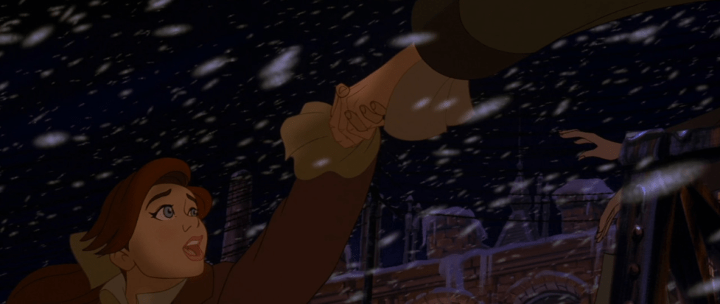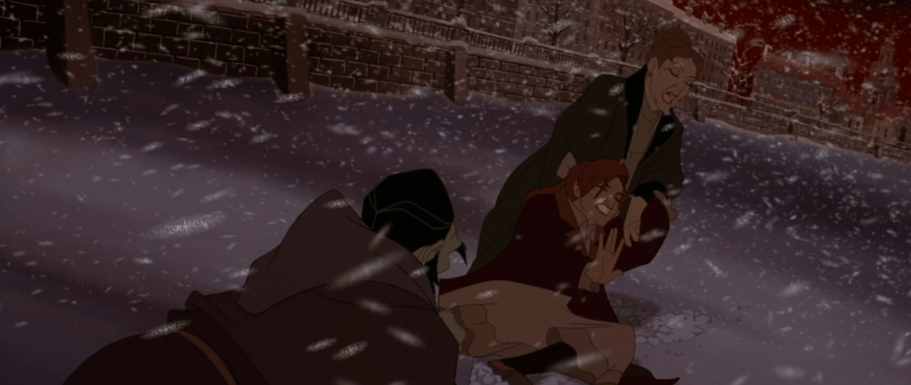 la dernière séquence du prologue est la fuite dans le train, ici le décors varie entre le côté sombre de la nuit et aussi de la situation, mélanger avec la neige, qui vient un peu adoucir la scène, Marie tente de faire montée sa petite fille dans le wagon pour s’enfuir loin du massacre, mais Anastasia n’y parvient pas et chute. la séquence ce termine par l’amas de foule qui vient cacher le corps inanimée de la princesse, histoire de faire un peu stresser le public sur la survie de la jeune fille. évidemment ça ne se finit pas comme ça.